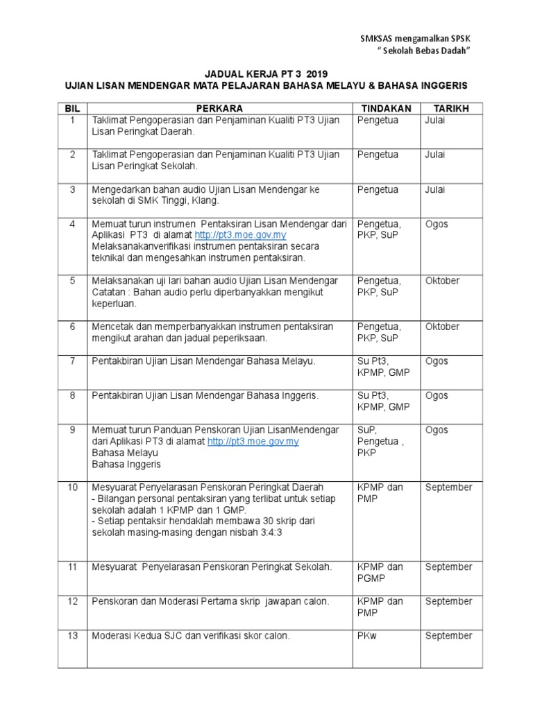 Sila klik pautan yang berkenaan di bawah untuk download fail pdf jadual waktu penuh PT3 2019. Oleh itu Calon-Calon sangat digalakkan untuk. JADUAL KERJA PENTAKSIRAN TINGKATAN 3 PT3 TAHUN 2019 JADUAL KERJA UJIAN LISAN.